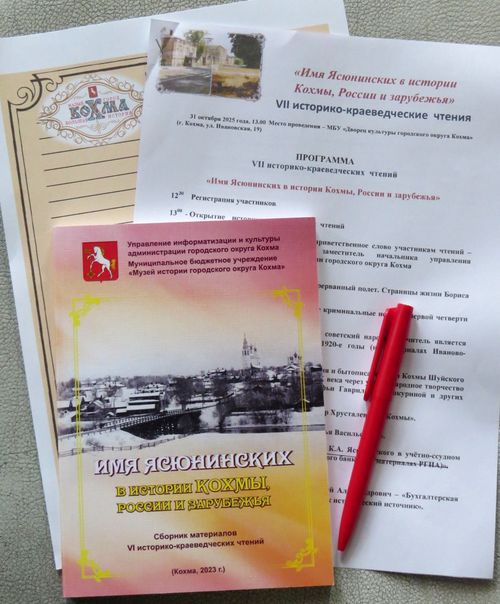 События 2012-2014 2015 2016 2017 2018 2019 2020 2021 2022 2023 2024 События и мероприятия 2025 г. "Ясюнинские чтения" в Кохме 31 октября 2025 года во Дворце культуры города Кохма состоялись VII областные историко-краеведческие чтения "Имя Ясюнинских в истории Кохмы, России и зарубежья". Основная проблематика чтений: история города Кохмы и Шуйского уезда Владимирской губернии, история рода Ясюнинских, развитие народного образования, культуры, здравоохранения и промышленности в нашем крае, меценатство, сохранение исторического наследия. Все присутствовавшие смогли услышать приветствие участникам чтений от семьи Есиковых-Ясюнинских, проживающих в далекой Аргентине. Для гостей была представлена выставка из фондов Музея истории городского округа Кохма и Централизованной библиотечной системы. С приветственным слово к участникам обратился председатель кохомской городской думы А.В. Ширстов. В конференции приняли участие историки, краеведы, учащиеся, студенты, деятели культуры, педагоги. В зале собралось более пятидесяти докладчиков и слушателей конференции из Кохмы, Иванова и Москвы. Прозвучавшие доклады были посвящены известным фабрикантам и меценатам города Кохма Ясюнинским, криминальной истории Кохмы в начале XIX века, светскому и религиозному образованию в 1920-х годах, фольклору и устному творчеству кохомчан, жителям города и их семьям, фронтовой переписке, ивановской прессе и становлению Кохмы как города. Приятно отметить, что среди выступавших были студенты и школьники, посвятившие доклады своим семьям и родословным. На чтениях прозвучал доклад сотрудников школы-музея "Литос-КЛИО" А.И. Лапыкина и С.А. Белякова "Бухгалтерская книга бывшей фабрики Ясюнинских за 1920 год как исторический источник". Выступавший соавтор доклада С.А. Беляков рассказал о хранящейся в Ивановском музее камня бухгалтерской расчетной книге и провел анализ ее содержания по должностному и профессиональному составу фабрики, гендерным показателям и соотношению жалований сотрудников разных должностей и ценам на основные продукты того времени. Всем докладчикам были вручены сувениры и сборники материалов с предыдущей конференции, проходившей в 2023 году.
