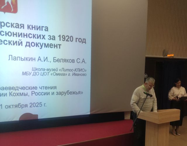 События 2012-2014 2015 2016 2017 2018 2019 2020 2021 2022 2023 2024 События и мероприятия 2025 г. "Ясюнинские чтения" в Кохме 31 октября 2025 года во Дворце культуры города Кохма состоялись VII областные историко-краеведческие чтения "Имя Ясюнинских в истории Кохмы, России и зарубежья". Основная проблематика чтений: история города Кохмы и Шуйского уезда Владимирской губернии, история рода Ясюнинских, развитие народного образования, культуры, здравоохранения и промышленности в нашем крае, меценатство, сохранение исторического наследия. Все присутствовавшие смогли услышать приветствие участникам чтений от семьи Есиковых-Ясюнинских, проживающих в далекой Аргентине. Для гостей была представлена выставка из фондов Музея истории городского округа Кохма и Централизованной библиотечной системы. С приветственным слово к участникам обратился председатель кохомской городской думы А.В. Ширстов. В конференции приняли участие историки, краеведы, учащиеся, студенты, деятели культуры, педагоги. В зале собралось более пятидесяти докладчиков и слушателей конференции из Кохмы, Иванова и Москвы. Прозвучавшие доклады были посвящены известным фабрикантам и меценатам города Кохма Ясюнинским, криминальной истории Кохмы в начале XIX века, светскому и религиозному образованию в 1920-х годах, фольклору и устному творчеству кохомчан, жителям города и их семьям, фронтовой переписке, ивановской прессе и становлению Кохмы как города. Приятно отметить, что среди выступавших были студенты и школьники, посвятившие доклады своим семьям и родословным. На чтениях прозвучал доклад сотрудников школы-музея "Литос-КЛИО" А.И. Лапыкина и С.А. Белякова "Бухгалтерская книга бывшей фабрики Ясюнинских за 1920 год как исторический источник". Выступавший соавтор доклада С.А. Беляков рассказал о хранящейся в Ивановском музее камня бухгалтерской расчетной книге и провел анализ ее содержания по должностному и профессиональному составу фабрики, гендерным показателям и соотношению жалований сотрудников разных должностей и ценам на основные продукты того времени. Всем докладчикам были вручены сувениры и сборники материалов с предыдущей конференции, проходившей в 2023 году.